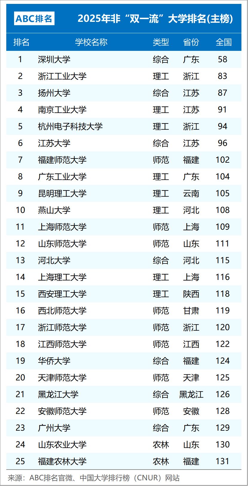ABC2025年双非院校排行榜显示,排名前5的双非院校,江苏省独占3所!分别是扬州大学、南京工业大学、江苏大学。