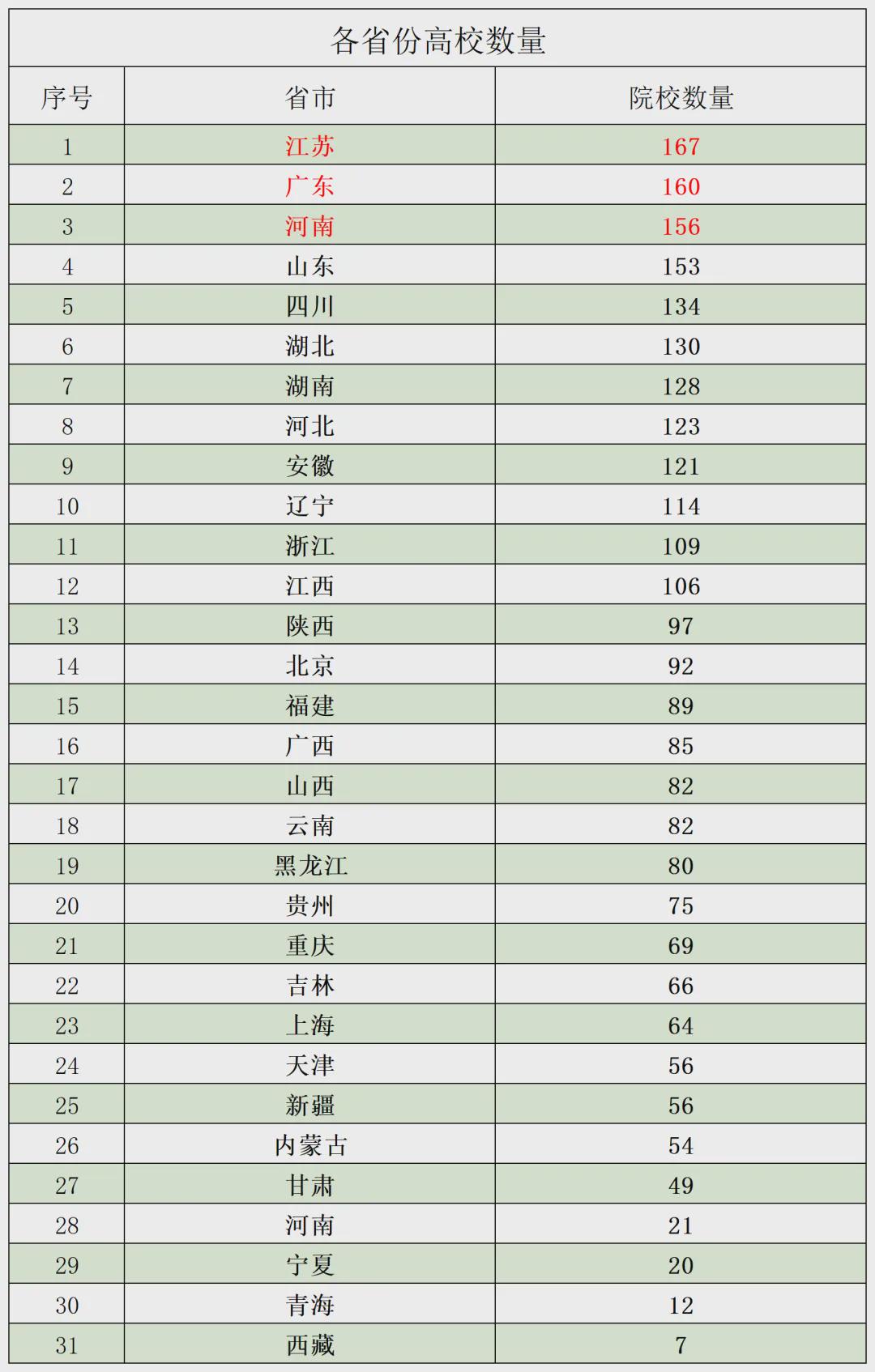 据统计,江苏省的高校数量位居全国第一,达到167所。紧追其后的分别是广东省(160所)、河南省(156所)、山东省(153所)。